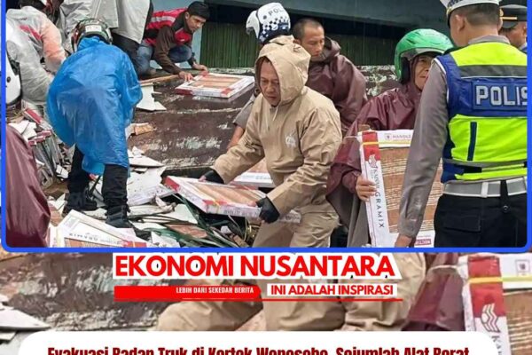 www.EkonomiNusantara.com.ǁJawa Tengah, 27 Desember 2025-Proses evakuasi kecelakaan lalu lintas tunggal truk tronton di Simpang Empat Kertek, Kabupaten Wonosobo, masih berlangsung sejak pagi hari, Sabtu (27/12/2025). Petugas kepolisian bersama warga membersihkan puing-puing keramik yang berserakan di badan jalan. Sejak pagi, warga dan petugas terlihat mengangkat satu per satu muatan keramik dari lokasi kejadian agar memudahkan proses…