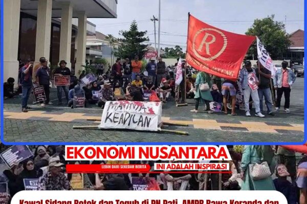 www.EkonomiNusantara.com.ǁJawa Tengah, 7 Januari 2026-Puluhan orang yang tergabung dalam Aliansi Masyarakat Pati Bersatu (AMPB) menggeruduk Pengadilan Negeri (PN) Pati, Rabu (7/1/2026). Sebagian personel AMPB ikut mengawal langsung ke dalam ruang sidang. Adapun sidang kali ini berfokus pada agenda pembacaan eksepsi oleh pihak terdakwa. Massa datang untuk memberikan dukungan morel kepada dua pentolan AMPB, yakni Teguh Istiyanto dan…