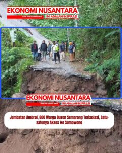 www.EkonomiNusantara.com.ǁJawa Tengah, 23 Februari 2026-Sekira 800 warga Desa Duren, Kecamatan Sumowono, Kabupaten Semarang terisolasi akibat jembatan ambrol pada Senin (23/2/2026) dini hari. Jembatan itu adalah satu-satunya akses warga menuju Desa Pledokan ataupun pusat pemerintahan Kecamatan Sumowono. Pasca ambrol, BPBD Kabupaten Semarang kini mengupayakan pembangunan jembatan kayu untuk sementara waktu agar aktivitas warga tidak terganggu dan…