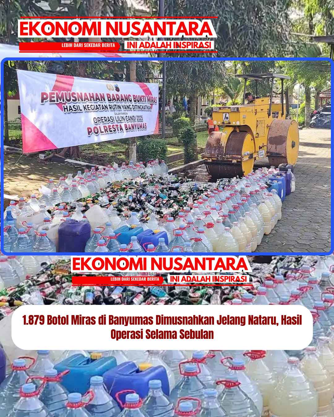 www.EkonomiNusantara.com.ǁJawa Tengah, 19 Desember 2025-Sebanyak 1.879 botol minuman keras (miras), 1.587 liter miras jenis ciu, serta 1.751 liter tuak dimusnahkan Polresta Banyumas dalam rangka Operasi Lilin Candi 2025, Jumat (19/12/2025).
