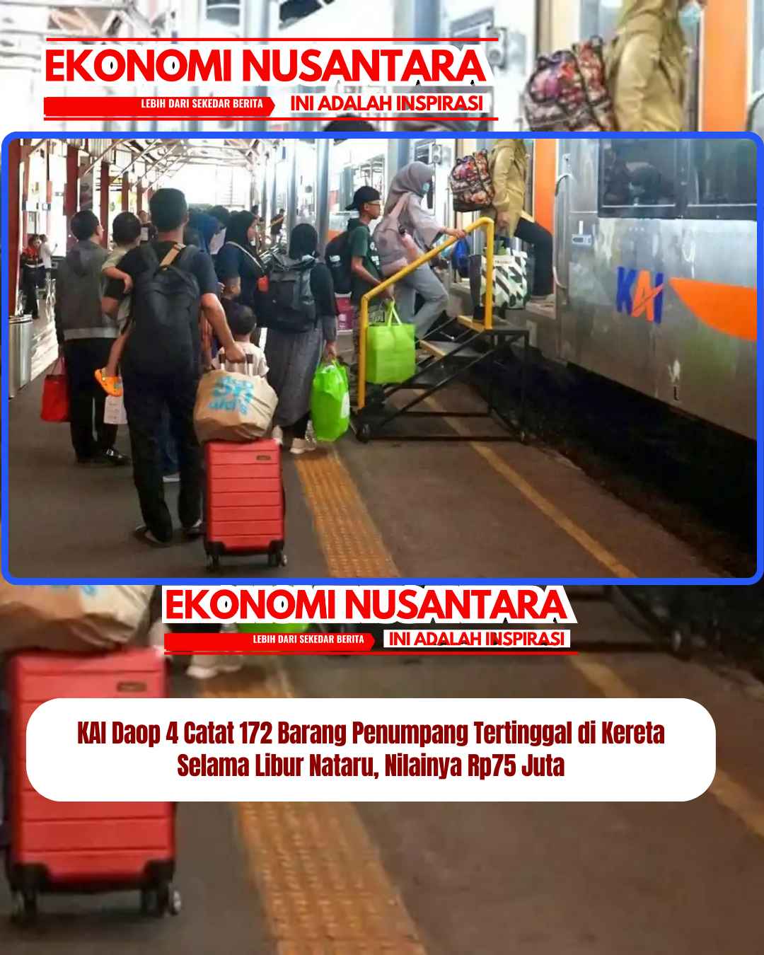 www.EkonomiNusantara.com.ǁJawa Tengah, 3 Januari 2026-Selama masa libur Natal 2025 dan Tahun Baru 2026 (Nataru), PT Kereta Api Indonesia (KAI) Daop 4 Semarang mencatat sebanyak 172 barang milik penumpang tertinggal di area stasiun maupun di dalam rangkaian kereta api.